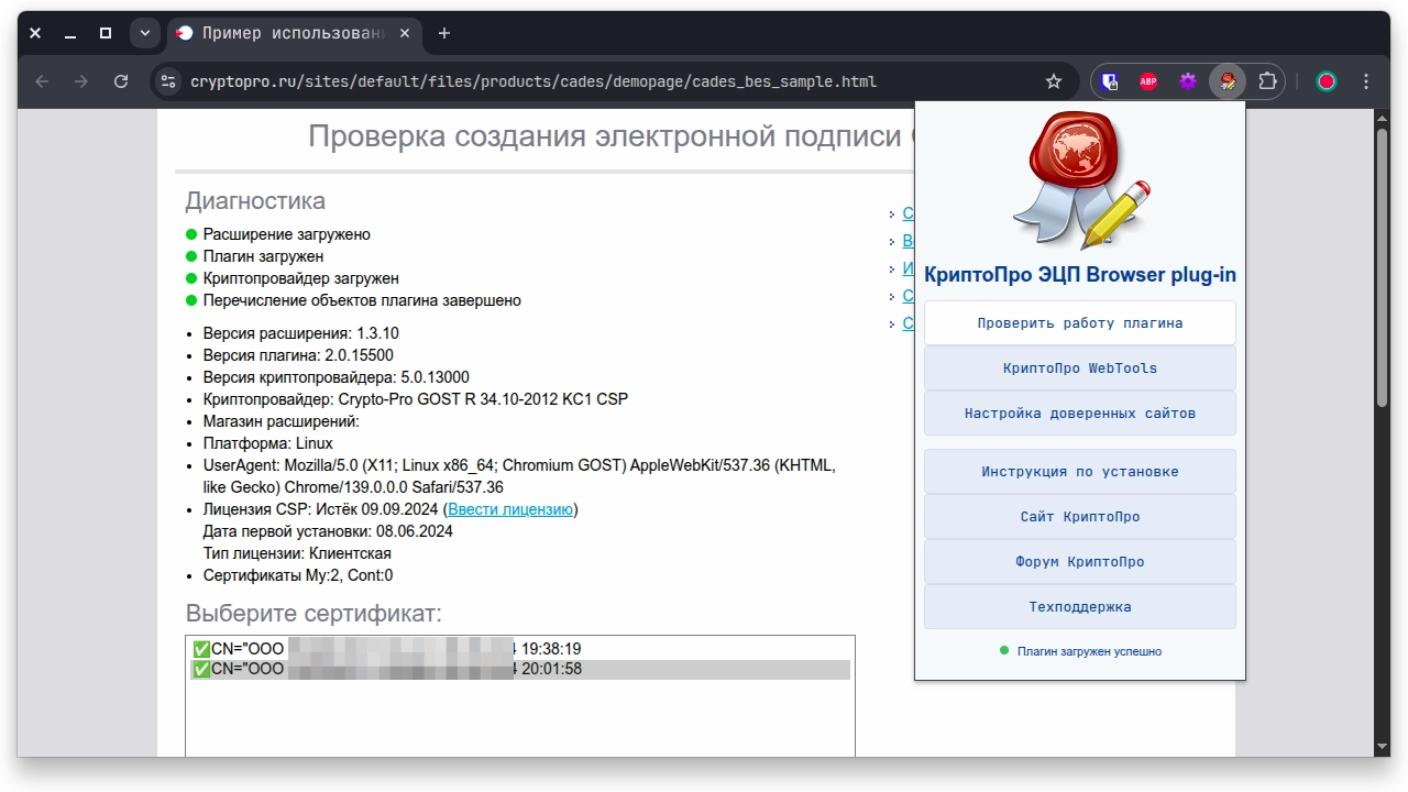 Перейдите по ссылке и проверьте работу крипто-провайдера, плагинов браузера, и работу в целом. Откройте Chromium-Gost и введите в адресную строку: