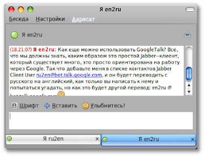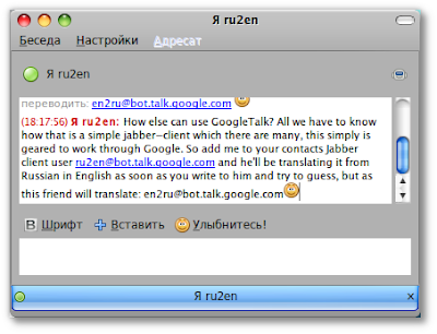 ru2en: How else can use GoogleTalk? All we have to know how that is a simple jabber-client which there are many, this simply is geared to work through Google. So add me to your contacts Jabber client user ru2en@bot.talk.google.com and he’ll be translating it from Russian in English as soon as you write to him and try to guess, but as this friend will translate: en2ru@bot.talk.google.com :)